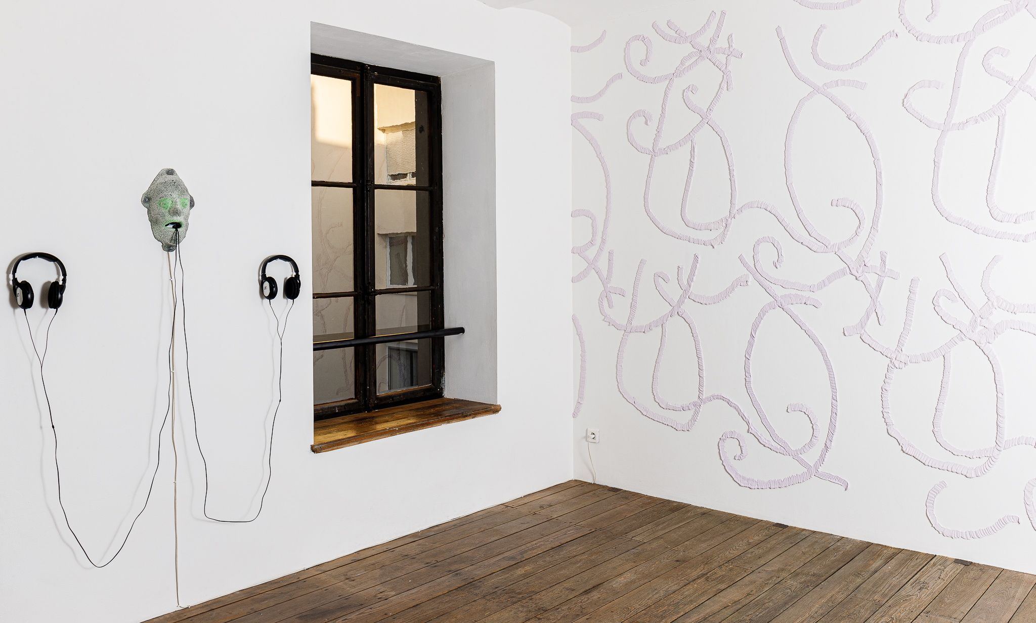 Un masque, interprété à partir de la Klapperstein de l’hôtel de ville de Mulhouse, a comme langue des fils de casque audio. On peut y entendre une composition originale réalisée avec les étudiants du cours d’alsacien de l’Office pour la Langue et les Cultures d’Alsace et de Moselle (OLCA).